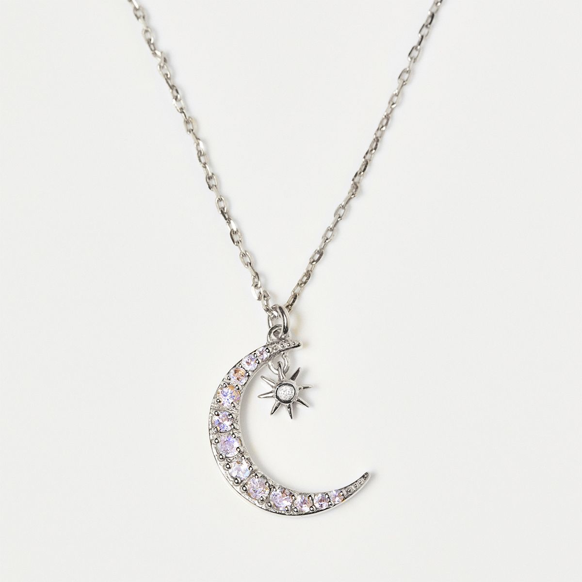 A beautiful crescent moon has been crafted in sterling silver and then set with iridescent moonstones. The little hanging star charm is then set with a single cut diamond.