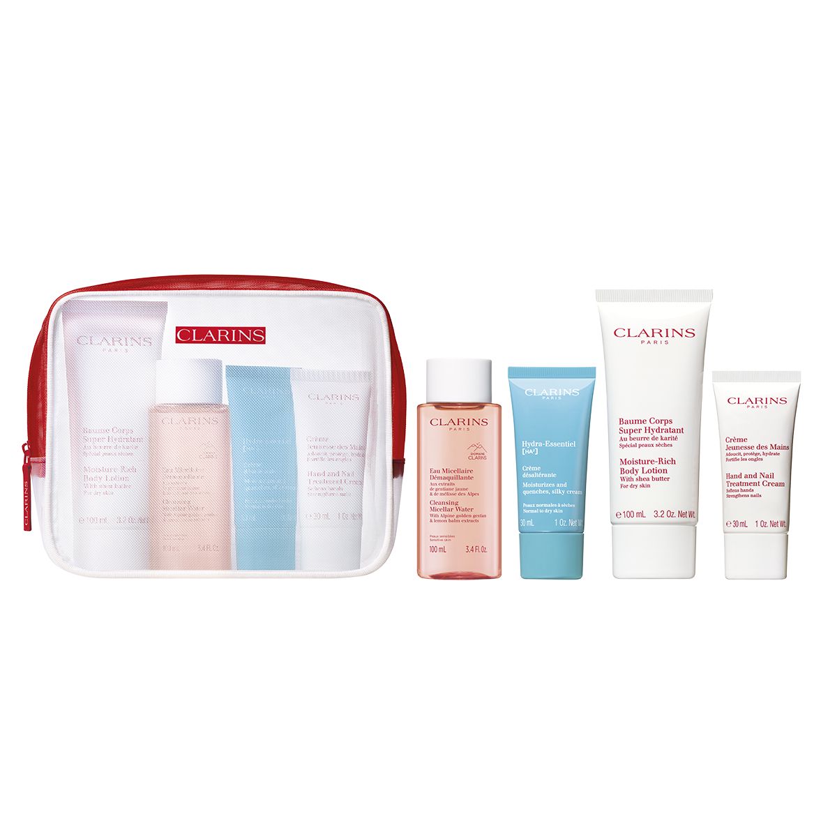 Travel with Clarins, your trusted beauty expert. This set includes five essential products, expertly formulated with plant extracts to help your skin stay fresh, hydrated, and radiant throughout your journey—keeping you looking and feeling your best from take-off to touchdown. This set contains: