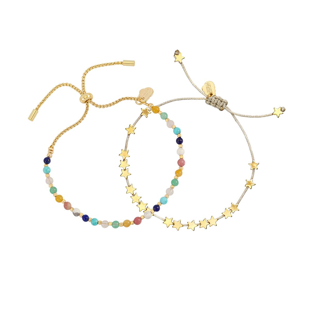Bring colour and charm to your jewellery collection with this vibrant Estella Bartlett bracelet set. One bracelet features semi-precious beads on an 18kt gold-plated adjustable chain for a bold, playful accent. The second is crafted with a silver-tone cord and finished with dainty gold star charms, adding a soft, celestial touch. Worn together or separately, these bracelets offer an easy, stylish layered look that complements everything from casual outfits to festival wear. Designed with adjustable closures to fit most wrist sizes, this set is made from 18kt plated recycled brass and genuine stones. It comes beautifully packaged—making it a thoughtful gift or personal treat, backed by a one-year warranty.