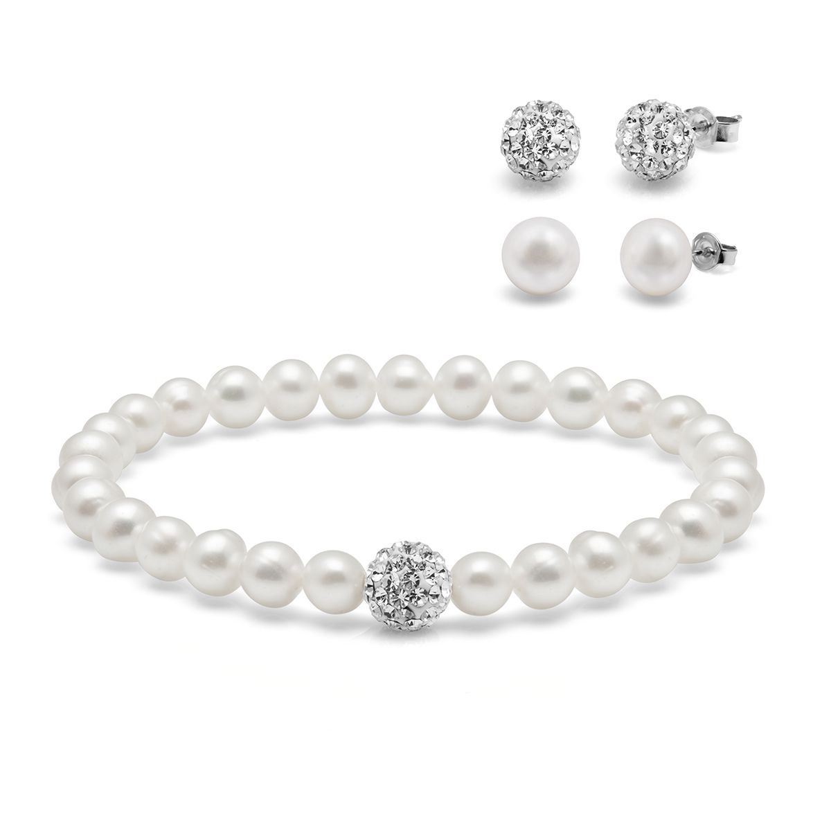 This elegant set includes a stretch bracelet and two earrings, each featuring genuine Freshwater Pearls set in 925 Sterling Silver with sparkling crystal balls for a contemporary touch. The earrings are secured with butterfly and post fittings for a comfortable, secure fit, while the stretch bracelet allows for effortless wear. Crafted from high-quality materials, this set is designed to bring you years of enjoyment.