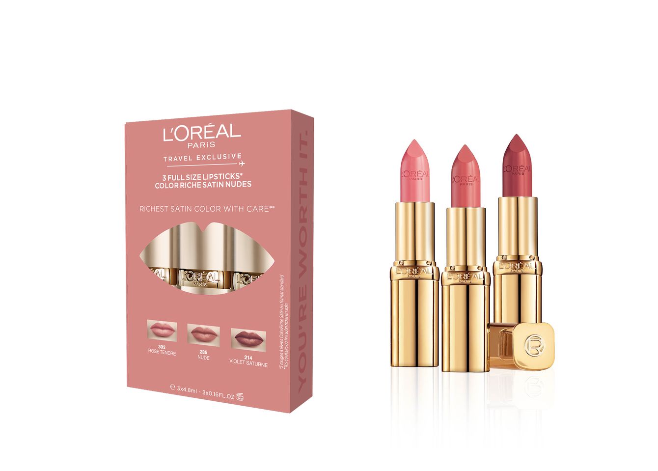 Elevate your lip routine with the colour Riche Nude Satin Creamy Lipstick Trio, featuring three flattering shades: Nude 235, Violet Saturne 214, and Rose Tendre 303. Each lipstick is packed with intense pigment and enhanced with a light-diffusing gel for a smooth, soft-focus powdery finish. The creamy formula glides on effortlessly, enriched with essential oils to deeply hydrate and soften lips in just one swipe. Whether you're going for subtle elegance or soft glam, this trio offers the perfect balance of colour, comfort, and care—making it your go-to for everyday luxury with a satin touch.