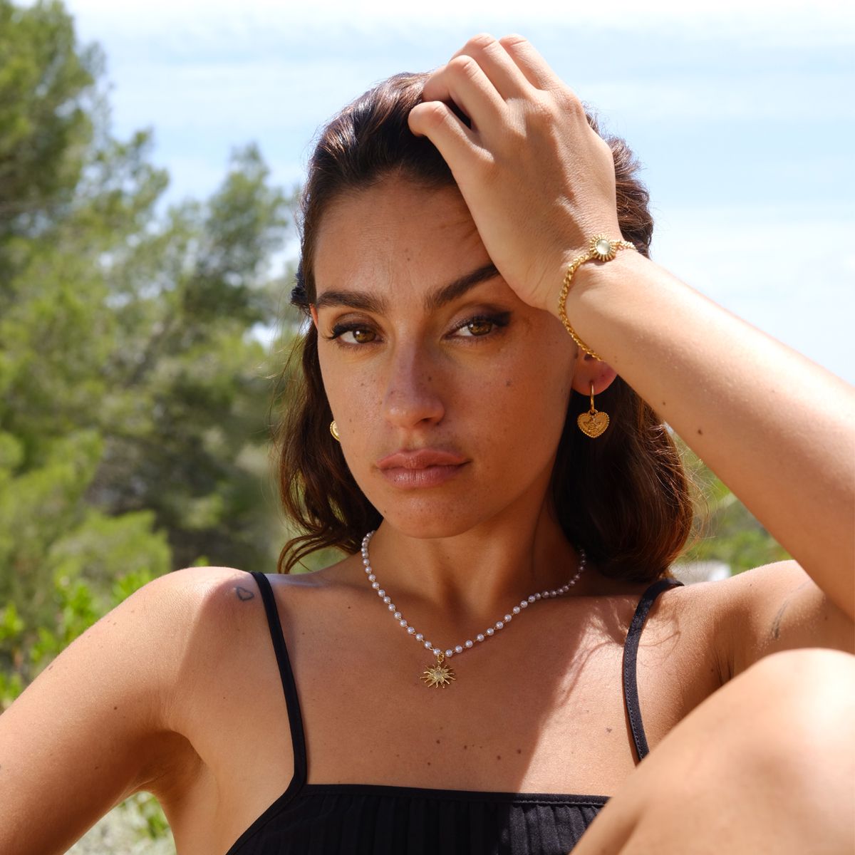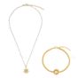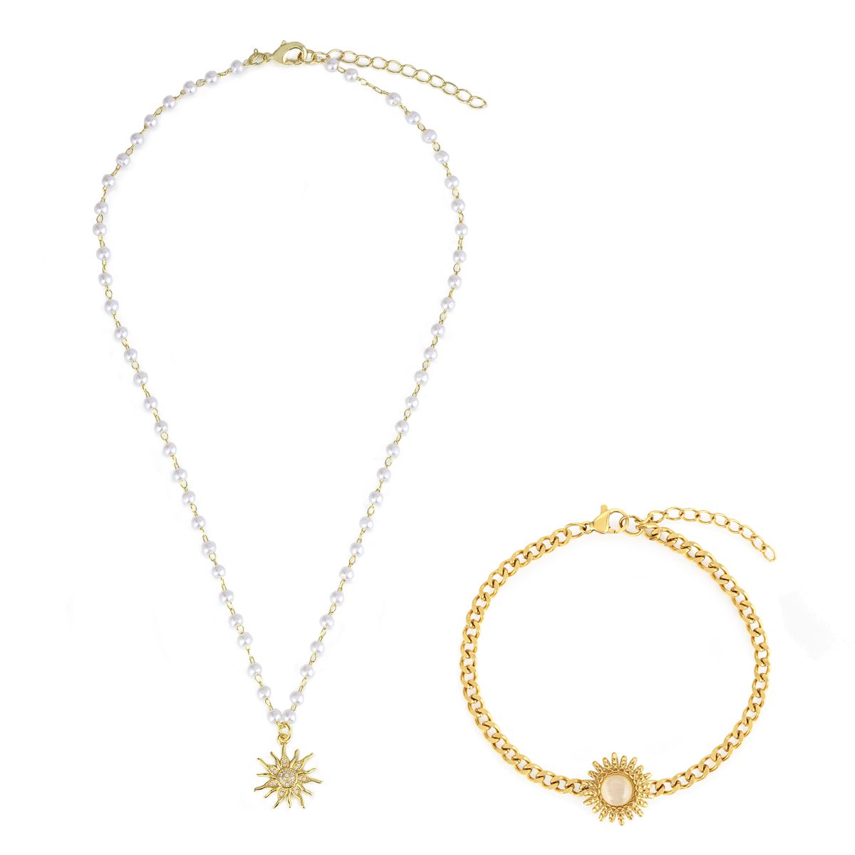 Glow all day with this radiant solar set, featuring sun pendants, shell pearls, sparkling zirconia, and opal-inspired accents. Crafted from hypoallergenic, water-resistant stainless steel, this set shines through showers, swims, and sweat. Necklace: 40+5cm. Bracelet: 17+3cm. Perfect for adding a luminous touch to any look, day or night.