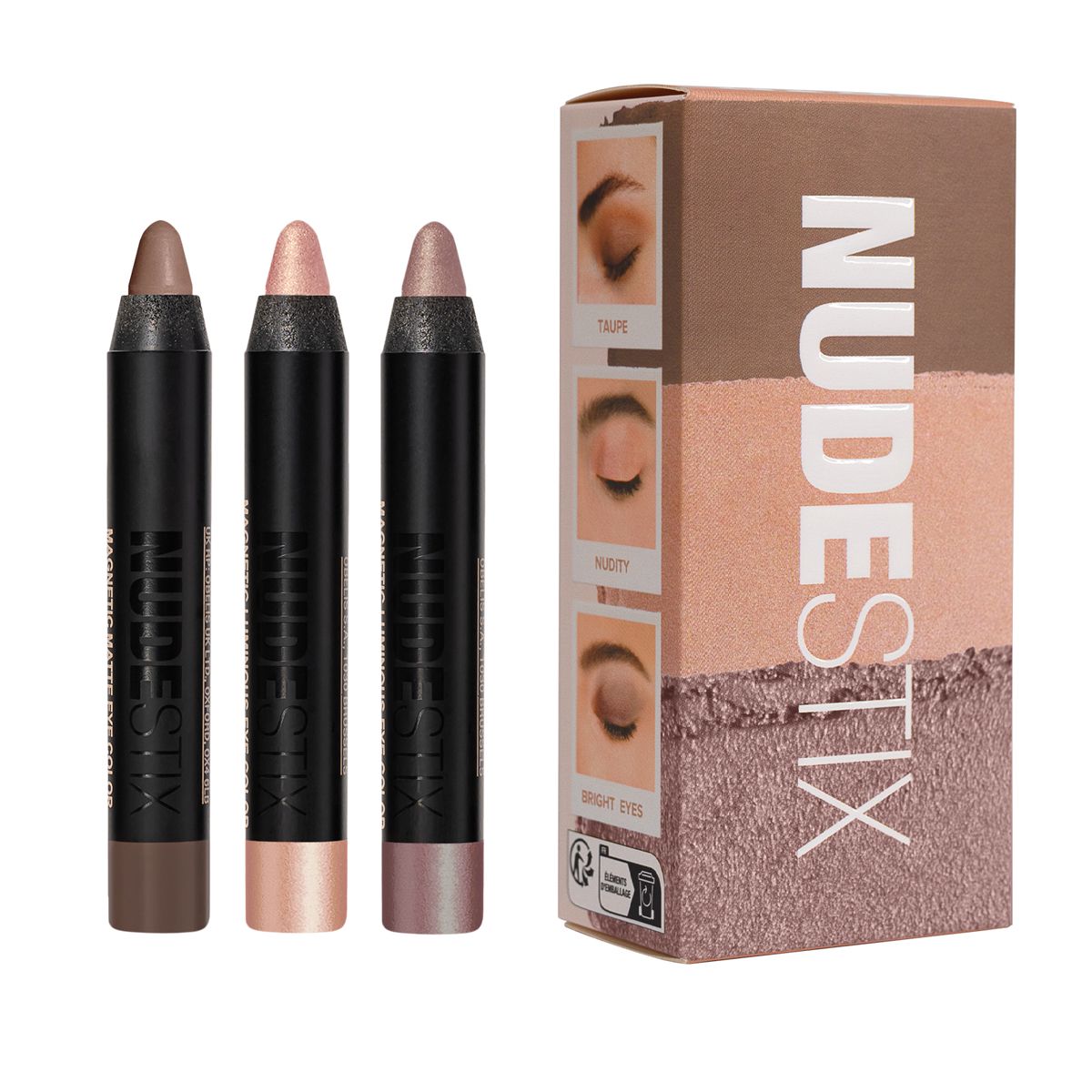 NUDESTIX’s Bright Nude Eyes 3-Piece Mini Kit includes luminous and matte eye pencils designed to give you a fresh, natural "nude but better" eye look. This compact, travel-ready kit lets you create bright, defined eyes with ease. Use Bright Eyes as a base, Taupe along the upper lash line, and Nudity in the inner corners to highlight. Whether worn individually or blended together, these creamy pencils offer effortless versatility and a radiant finish. Housed in a reusable NUDESTIX tin with a built-in mirror, it’s ideal for quick touch-ups and flawless eye makeup wherever you are.