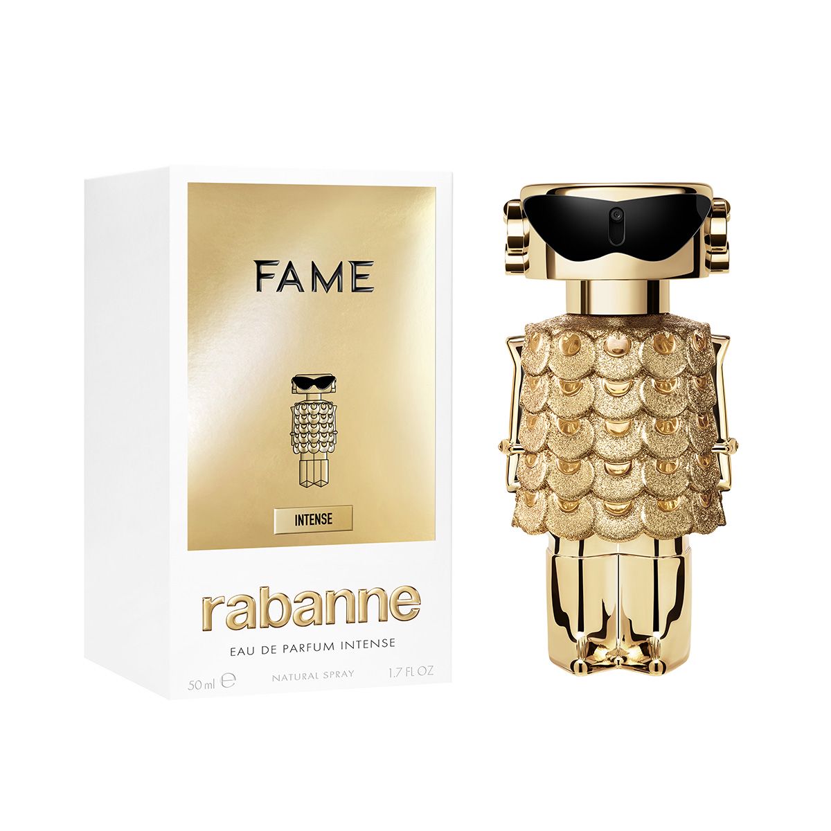Crafted with Rabanne’s signature avant-garde spirit, FAME Intense is a unique feminine fragrance designed for the woman who owns her light. Radiant and spontaneous, she shines effortlessly as solar jasmine blends with opulent incense and creamy sandalwood. This refined fragrance is responsibly formulated using some of the most precious, ethically sourced ingredients. It opens with an uplifting mix of coconut water, Italian bergamot essence, and a hint of pink pepper. At the heart, a tailor-made incense trio fuses with exotic ylang ylang extract and luminous solar jasmine. The base unfolds with smooth sandalwood cream, mineral musk, and Virginia cedarwood essence for a lasting, sensual finish. True to Rabanne’s couture heritage, the bottle dazzles in a golden reinterpretation of the iconic chainmail dress—bold, glamorous, and unmistakably you. FAME Intense isn’t just a fragrance; it’s your time to sparkle and shine with every step, in every room.