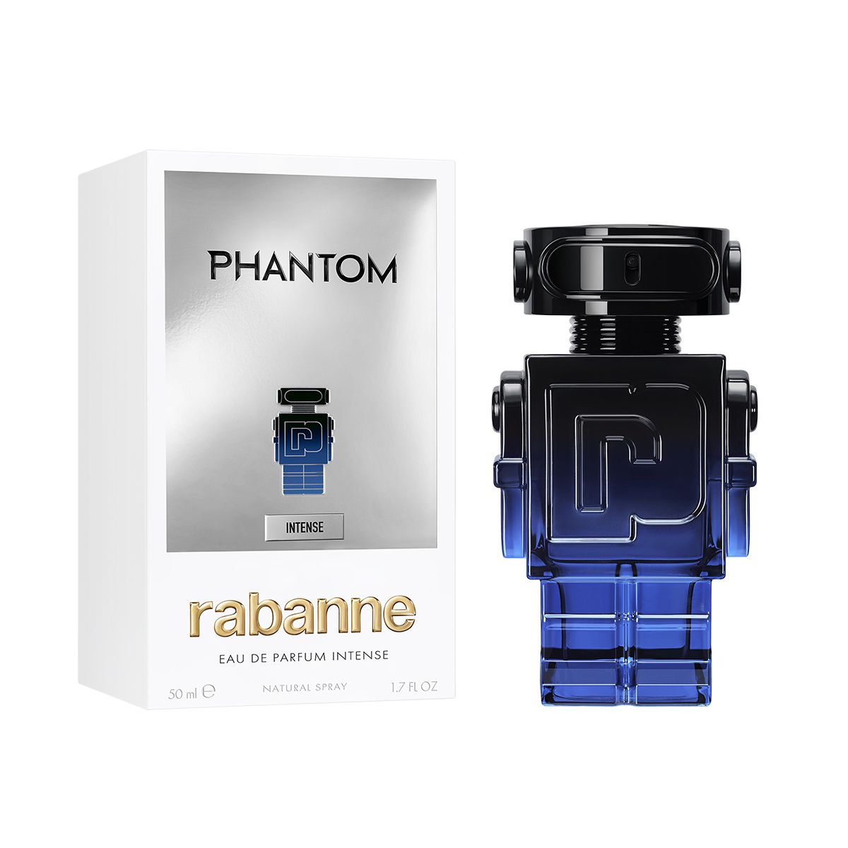 Crafted with Rabanne’s signature avant-garde spirit, Phantom Intense is a bold fragrance that captures the energy and allure of Paris at dusk. Designed for the thrill-seeking night owl, it opens with a vibrant blend of frosted orange blossom, lemon, and cardamom oil. The heart reveals a powerful combination of vivid lavender, clary sage oil, and warming rum absolute, bringing depth and intrigue to the scent. At its base, smooth vanilla bean, cedarwood oil, and modern moss create a rich, addictive finish that lingers long into the night. Responsibly formulated with precious, ethically sourced ingredients, Phantom Intense is both refined and rebellious. Its elevated bottle, featuring a striking black-to-blue gradient, reflects the shifting light of twilight and the inner glow of the one who wears it.