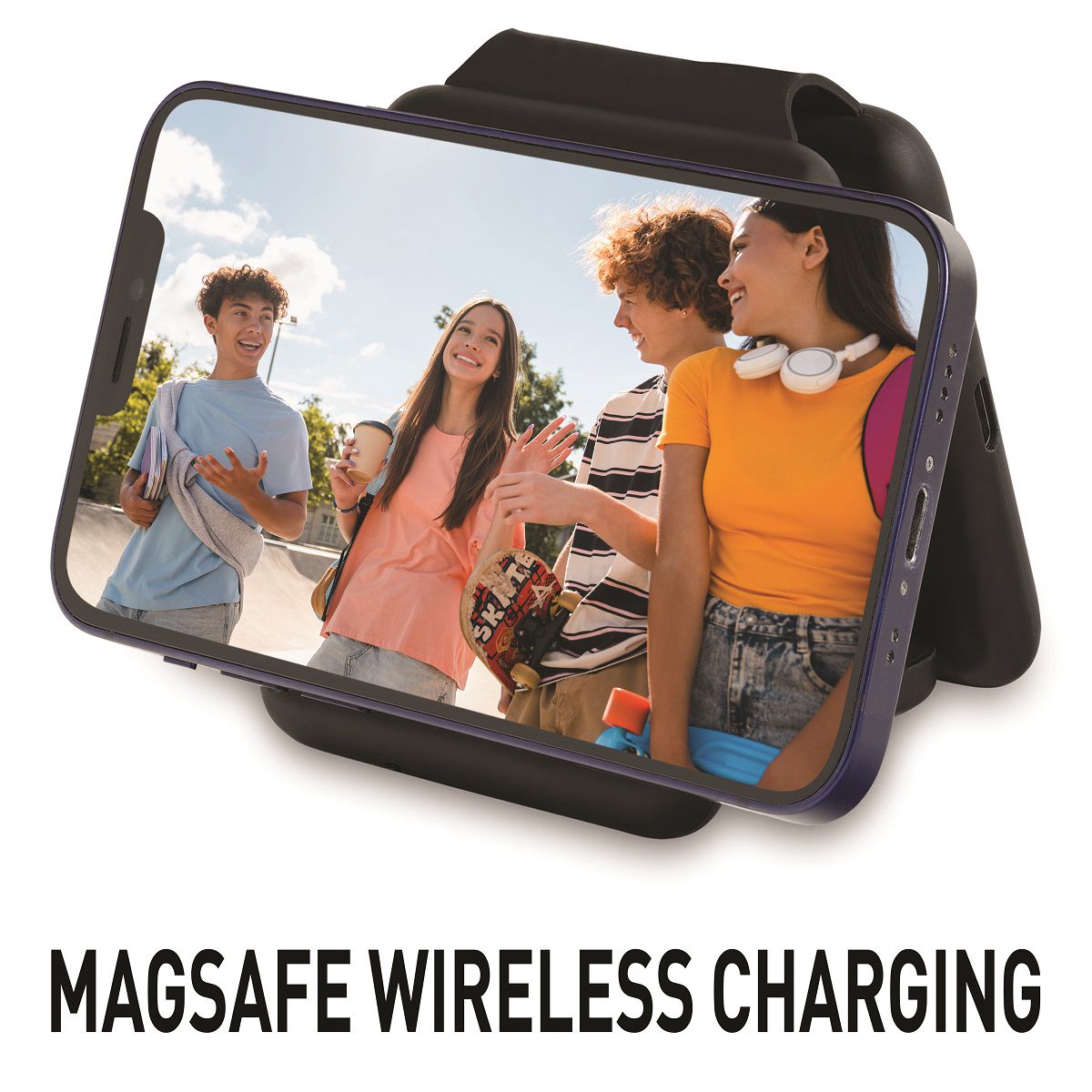 This mains-powered, minimalist wireless charger folds flat for pocket or backpack portability, keeping your workspace clutter-free and doubling as a sturdy phone stand during charging. Compatible with MagSafe and Qi devices, it delivers reliable power via a secure dock with non-slip surfaces and features an LED indicator for charging status and integrated cable management. Simple to set up: just plug into the mains, unfold the stand, and align your device for seamless charging. Ideal for home, office, or travel, it combines functionality and sleek design for effortless daily use.