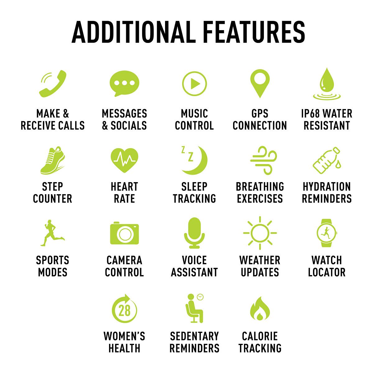 Packaged in a stylish gift box with a manual, USB charger, and backed by a two-year guarantee, this smartwatch is compatible with Android 9.0+ and iOS 12+. Download the free Reflex Active Blue App to unlock even more features and truly elevate your training and travel experiences.