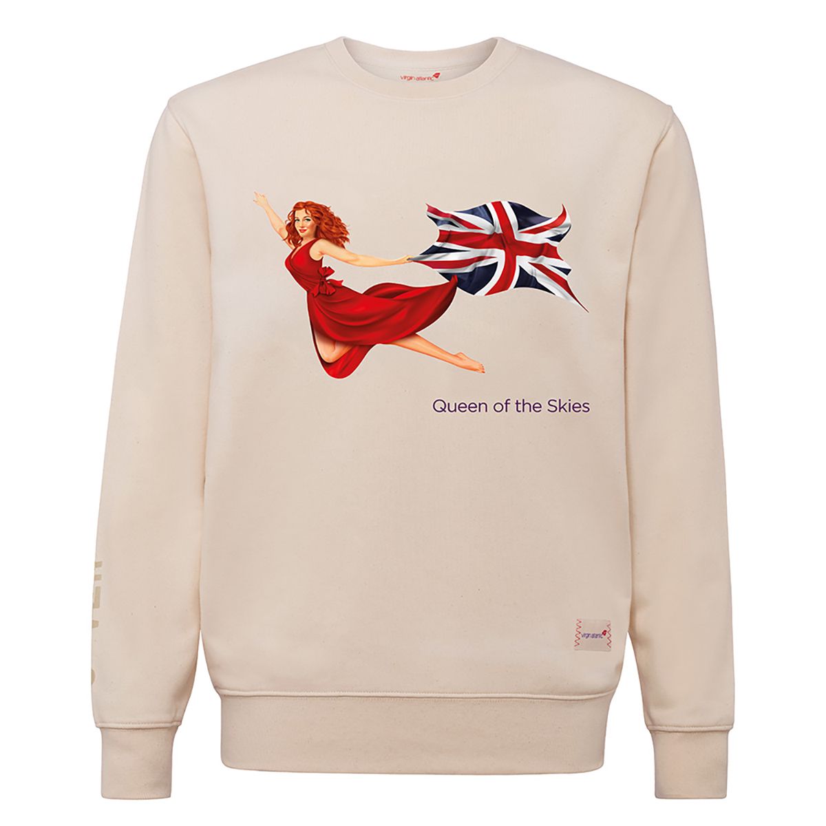 Fly in comfort and style with the Flying Icon Queen of the Skies sweatshirt. This unisex jumper features artwork from Virgin Atlantic’s A330neo aircraft Queen of the Skies (registration G-VEII), created in tribute to the much-loved and never forgotten Queen Elizabeth.